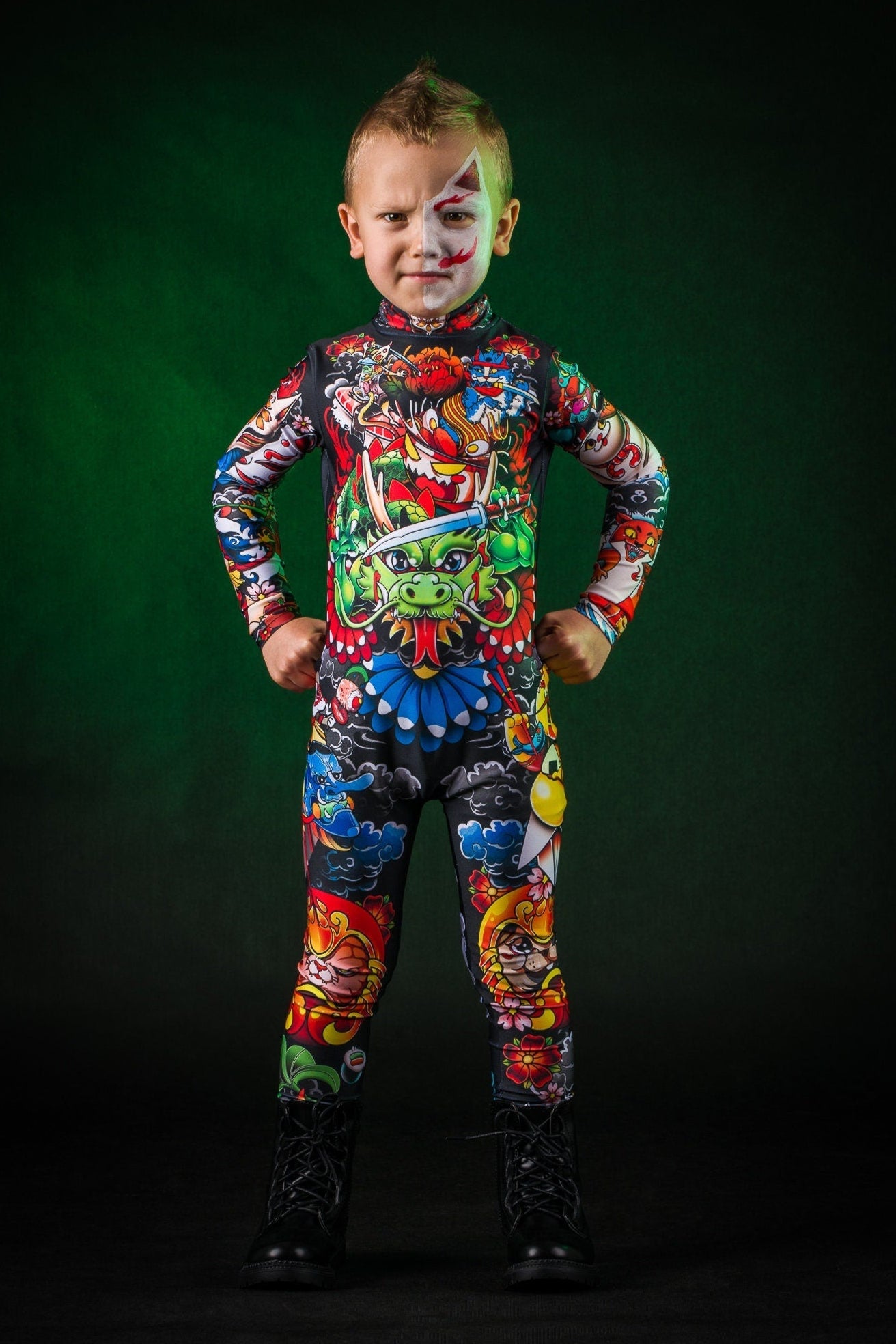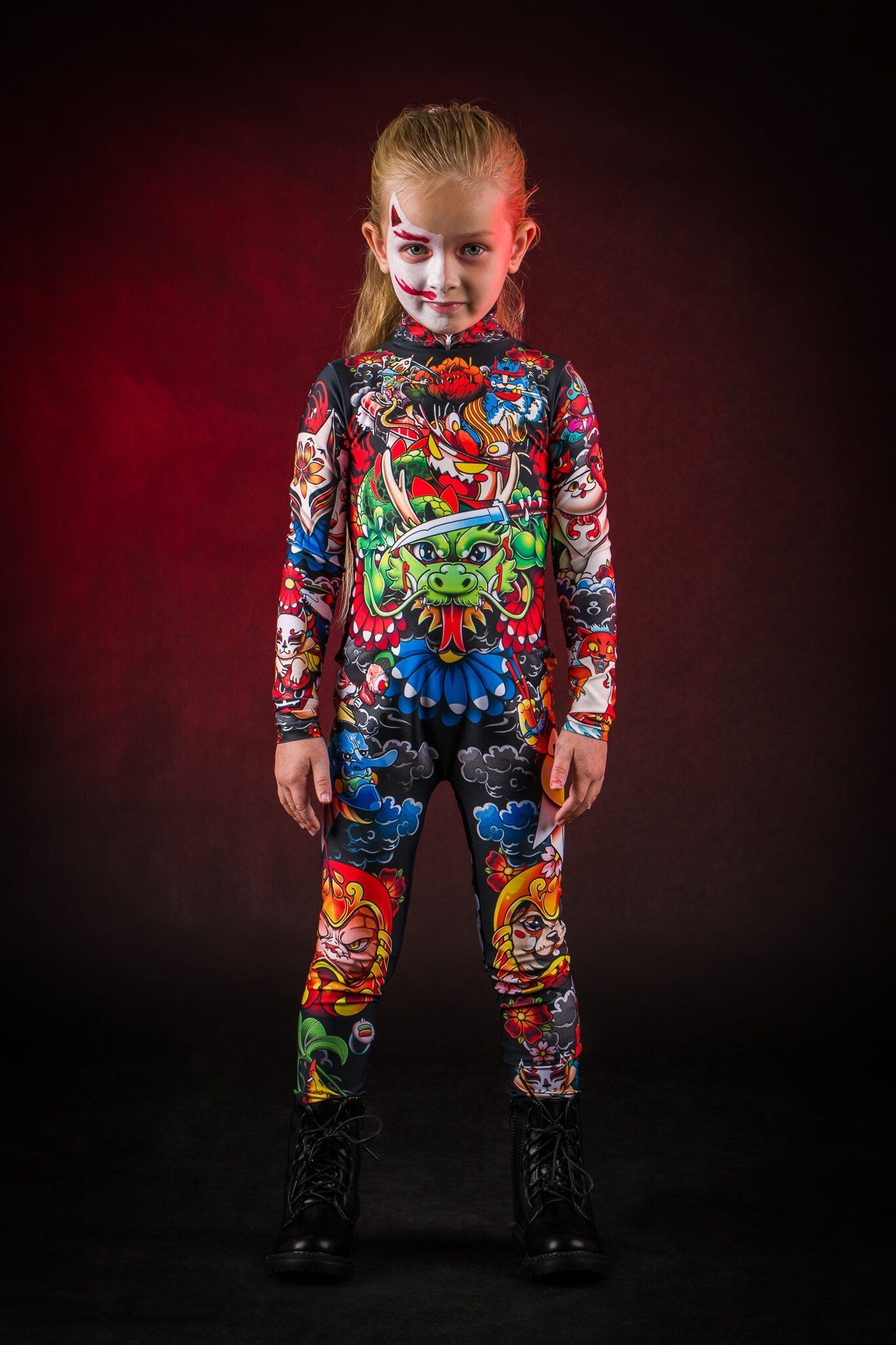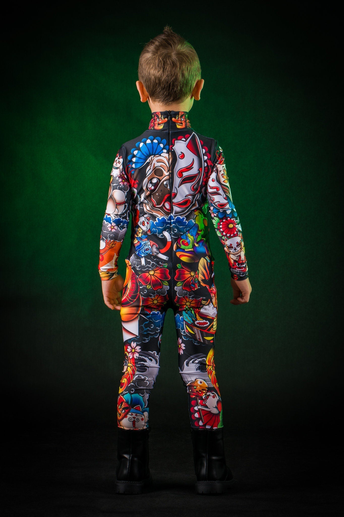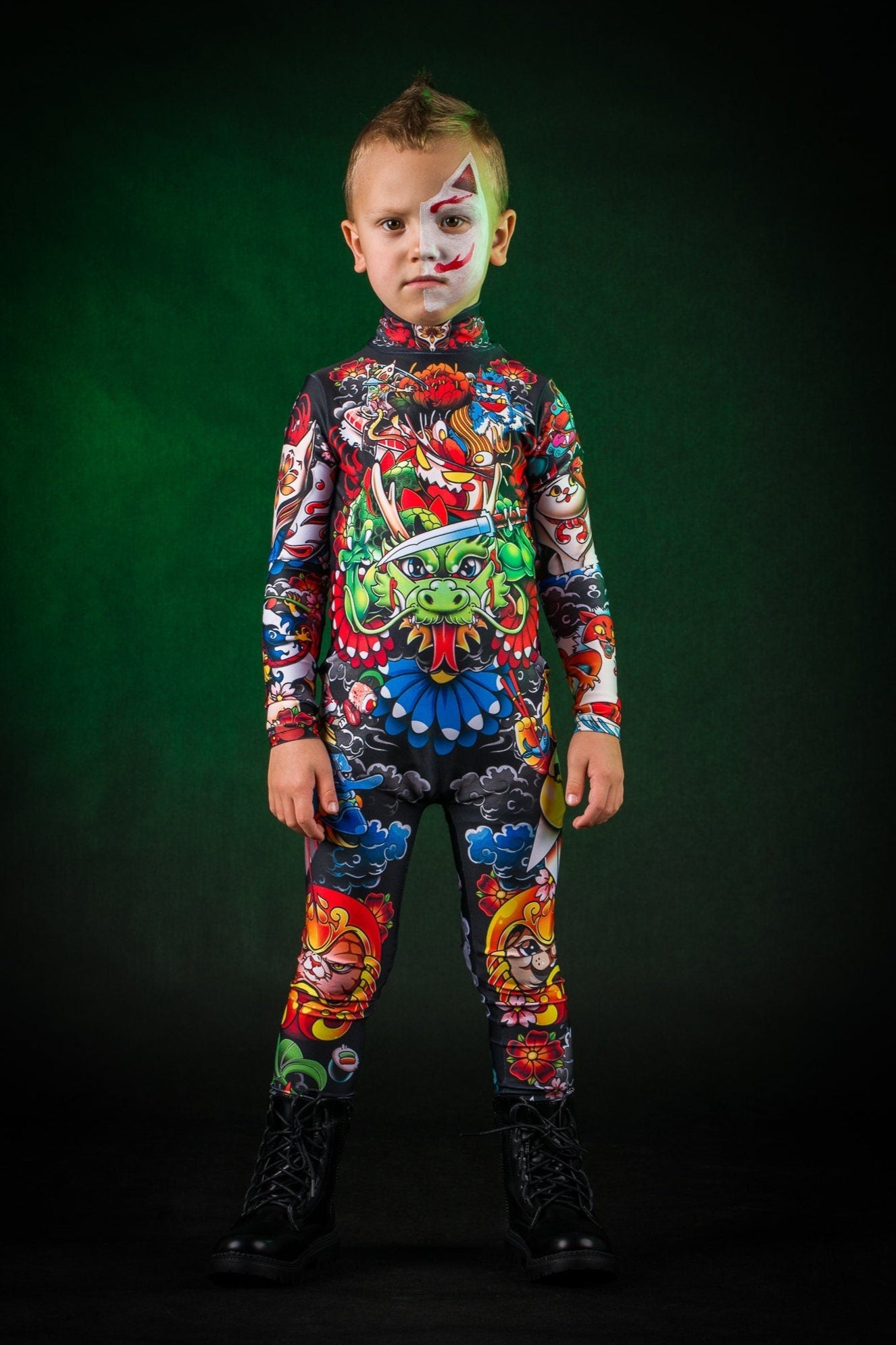 Przenieś swoją pociechę do świata pełnego tajemnic i niezwykłych motywów! Wybierz kombinezon z wyrazistym nadrukiem, pełnym zwierzęcych symboli, smoka i hipnotyzujących wzorów – idealny na bale przebierańców, Halloween i inne wyjątkowe okazje. 🐉✨