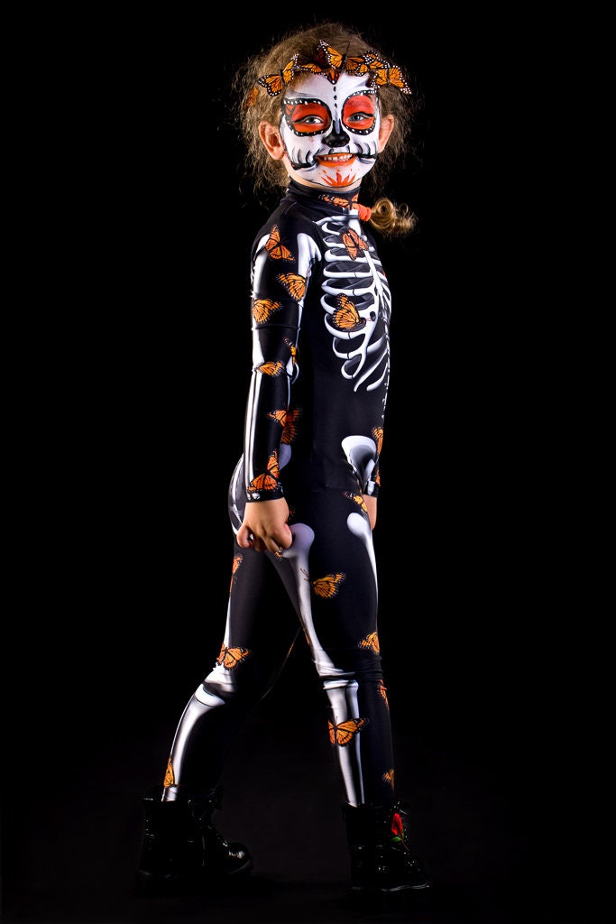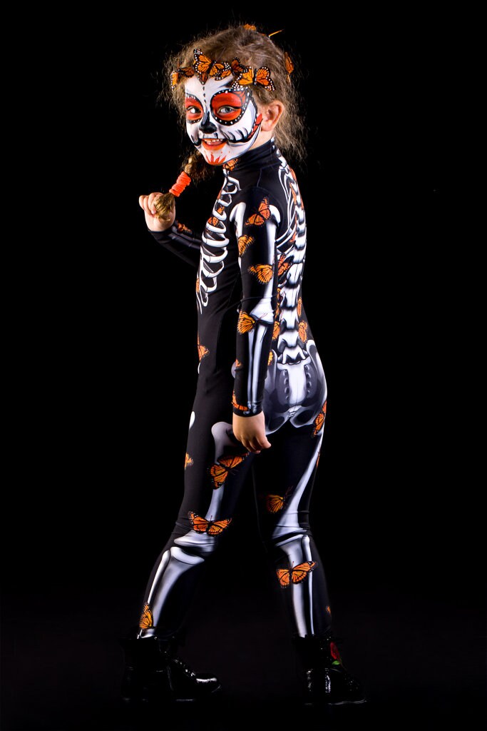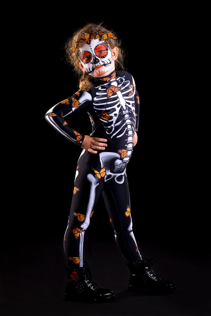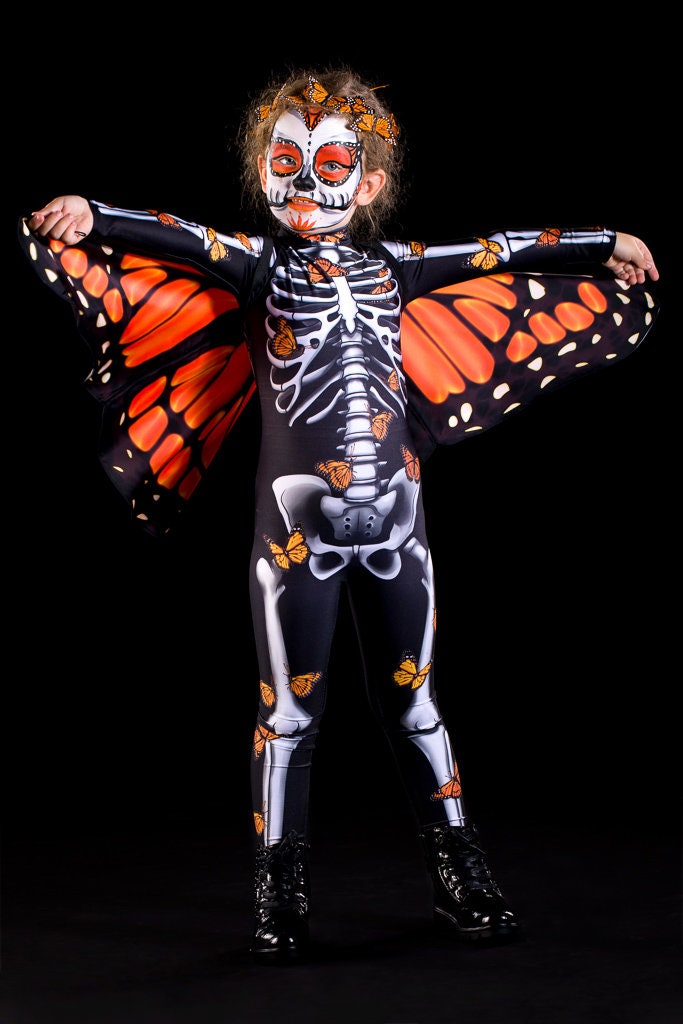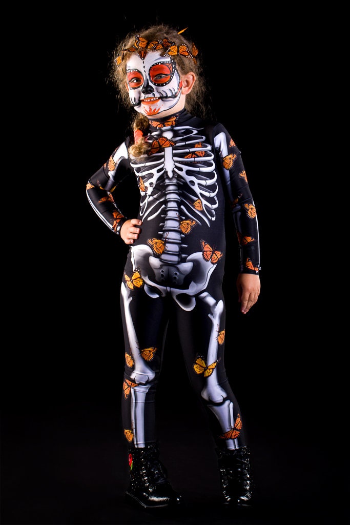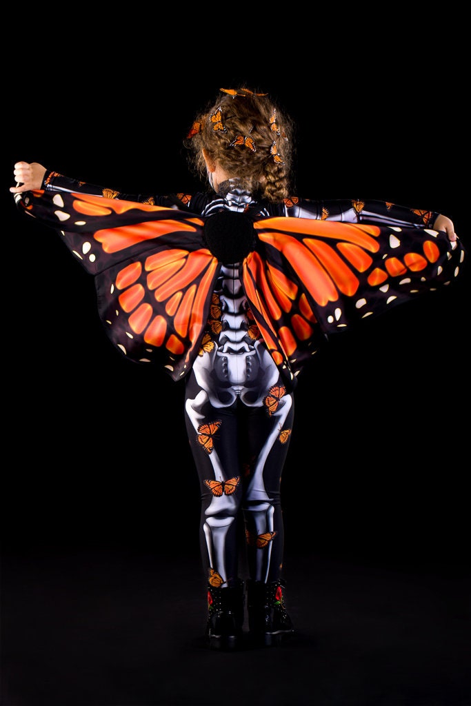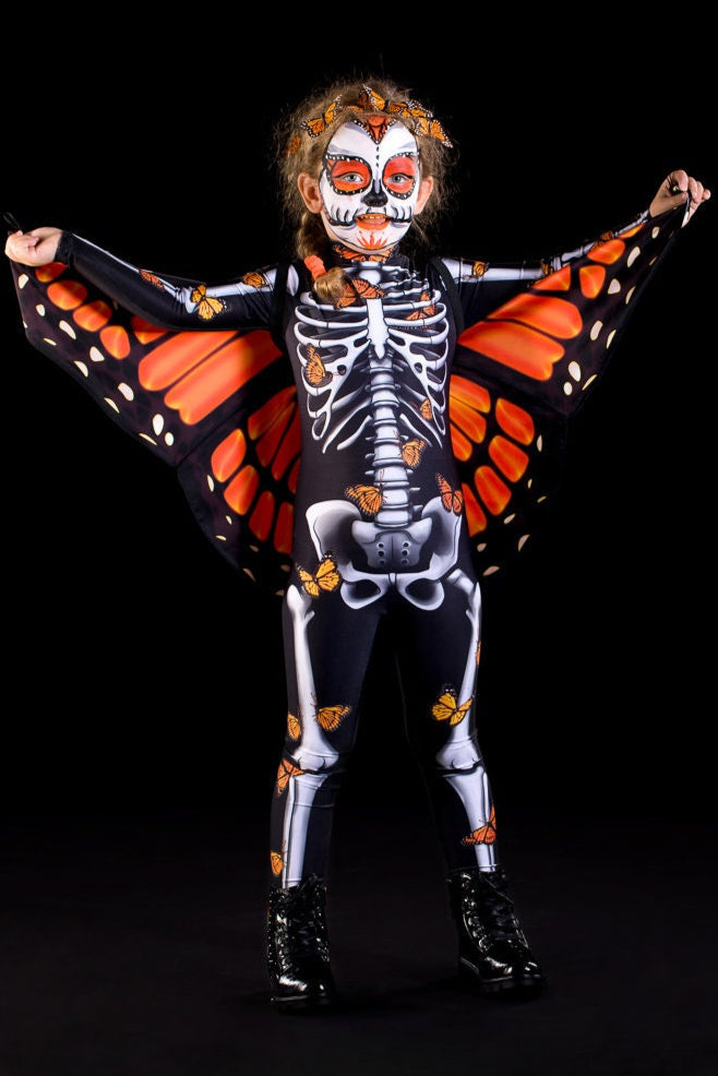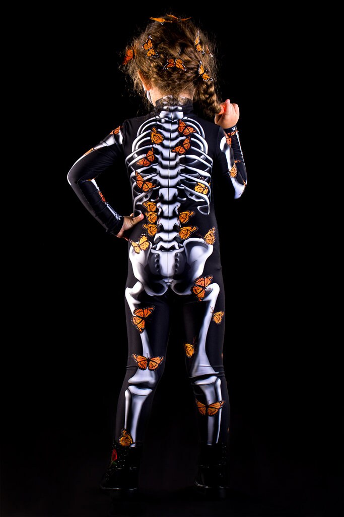Przygotuj się na niezapomnianą przygodę Halloween! Nasz kombinezon z nadrukiem szkieletu i pomarańczowych motyli to doskonały wybór, łączący unikalny design z komfortem na cały dzień. 🎃✨