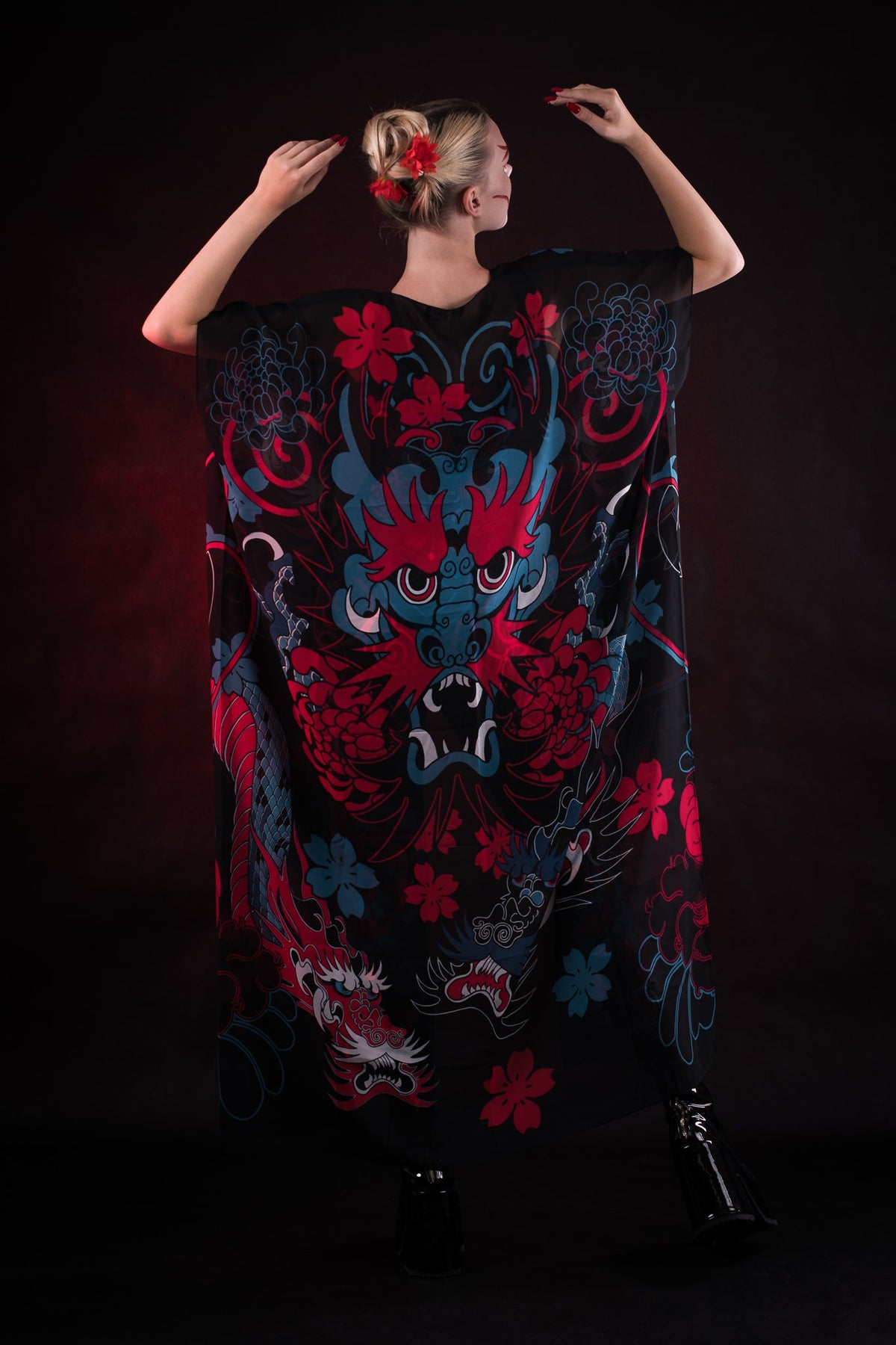 Dodaj swojej garderobie nutę tajemnicy i wyjątkowego charakteru dzięki tej niezwykłej propozycji. Zwiewny materiał i spektakularny design czynią kimono nieodłącznym elementem stylizacji inspirowanych Orientem i klimatem Halloween.