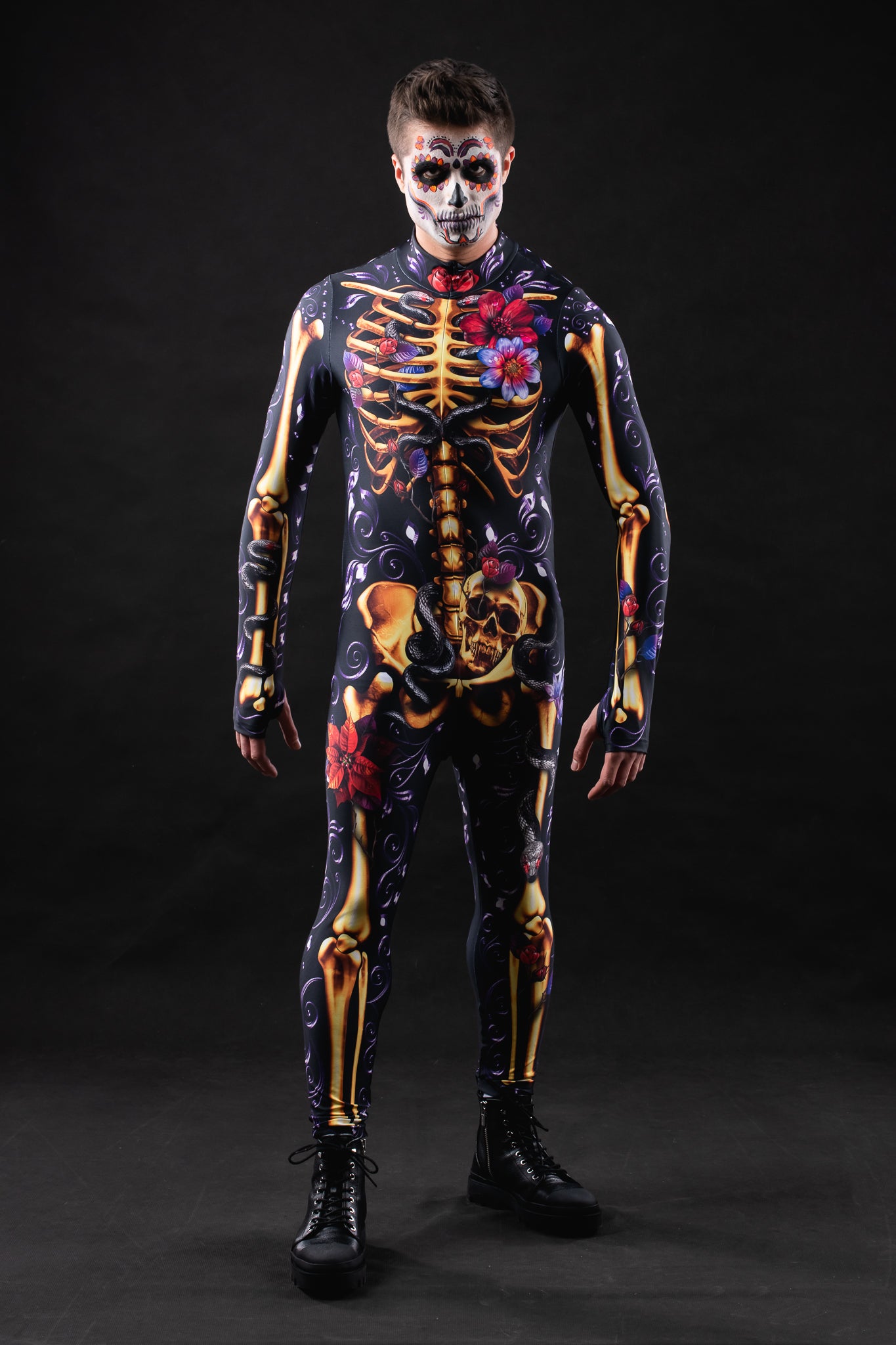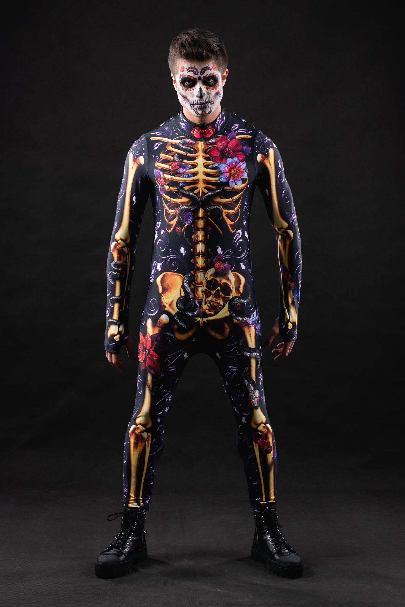 Chcesz zrobić wrażenie na halloweenowej imprezie? Nasz kombinezon z motywem szkieletu, kwiatów i węży to idealne połączenie mrocznego stylu i wygody – stworzony, by przyciągać spojrzenia przez całą noc! 🎃✨