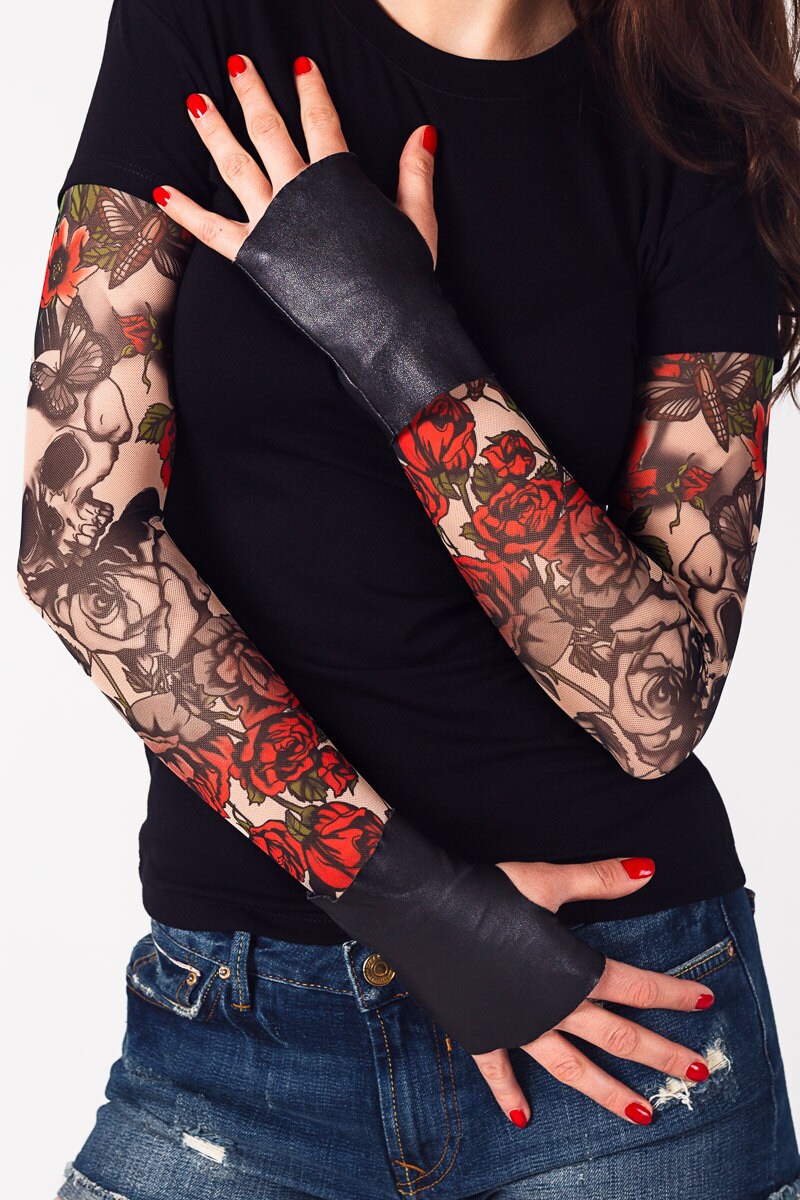 Bardzo stylowe i wygodne mitenki z eko skóry, które doskonale komponują się z naszymi ubraniami z efektem tatuażu. 🌿 Są krótkie, kończą się tuż za nadgarstkiem, idealnie maskując przejście rękawa w prawdziwą skórę. Załóż je, aby Twój tatuaż wyglądał jeszcze bardziej realistycznie! 💀