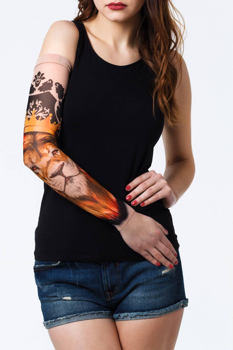 Rękaw z tatuażem lwa w złotej koronie – na damskiej ręce, widok z przodu