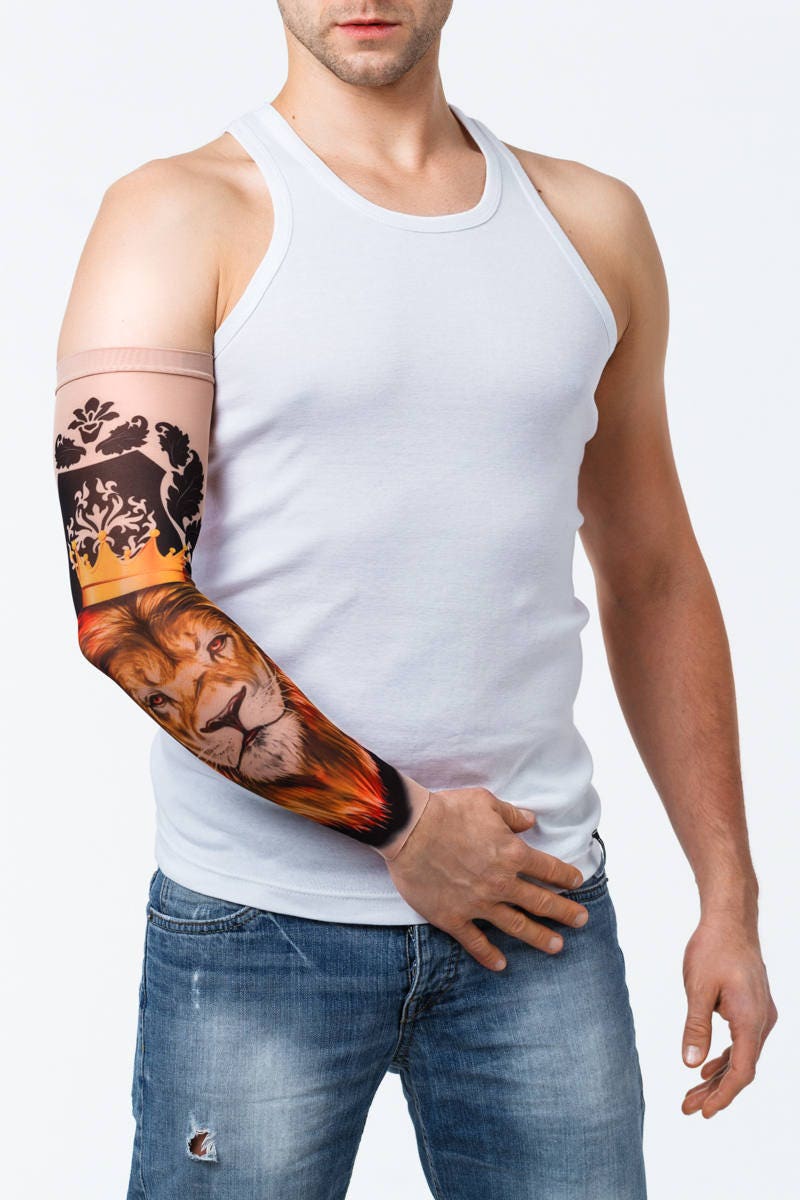 Rękaw z tatuażem lwa w złotej koronie – na męskiej ręce, widok z przodu