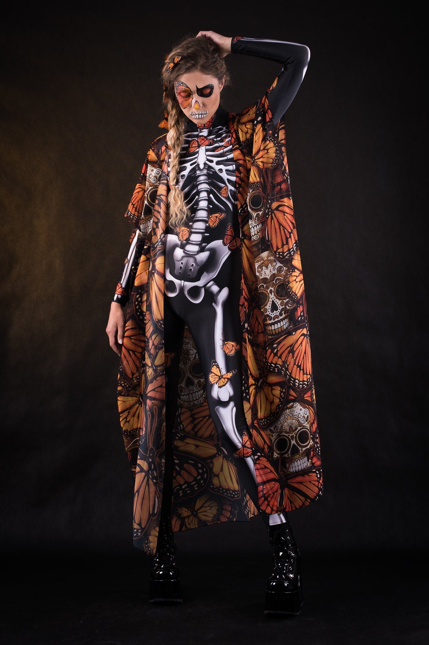 Chcesz wyróżnić się na Halloweenowej imprezie? Nasz kombinezon z motywem szkieletu i pomarańczowych motyli to doskonały wybór, łączący wyjątkowy design z komfortem na cały dzień (i noc!) 🎃✨