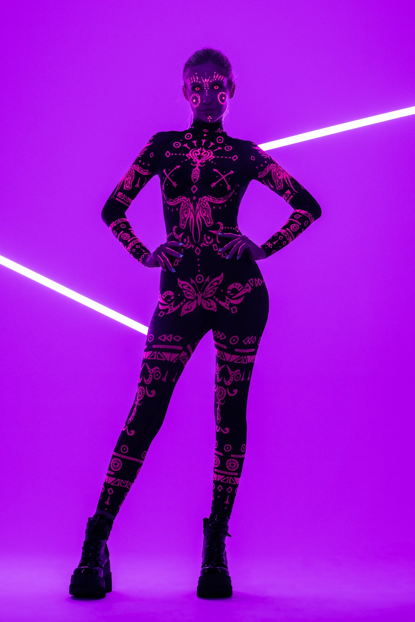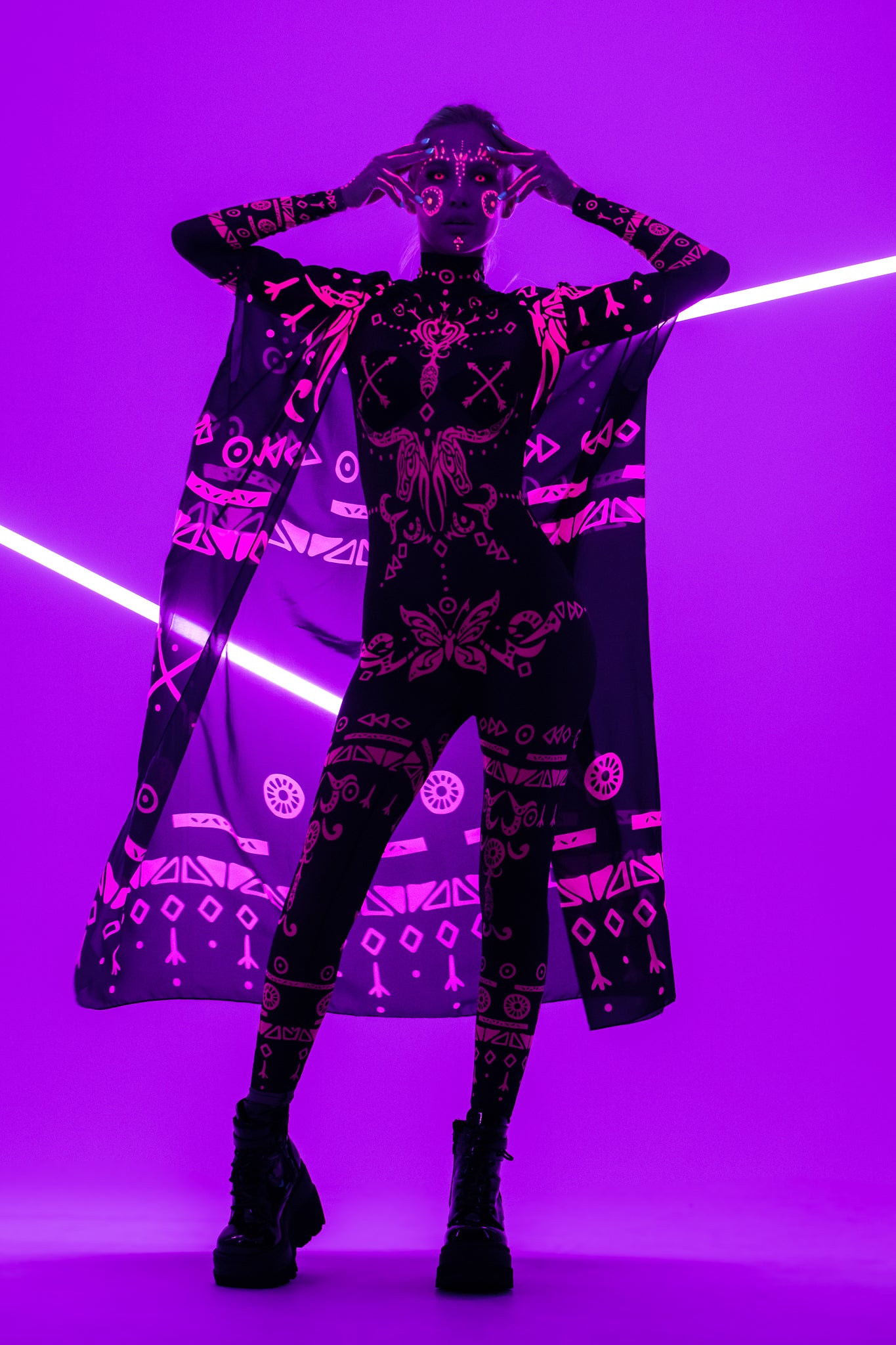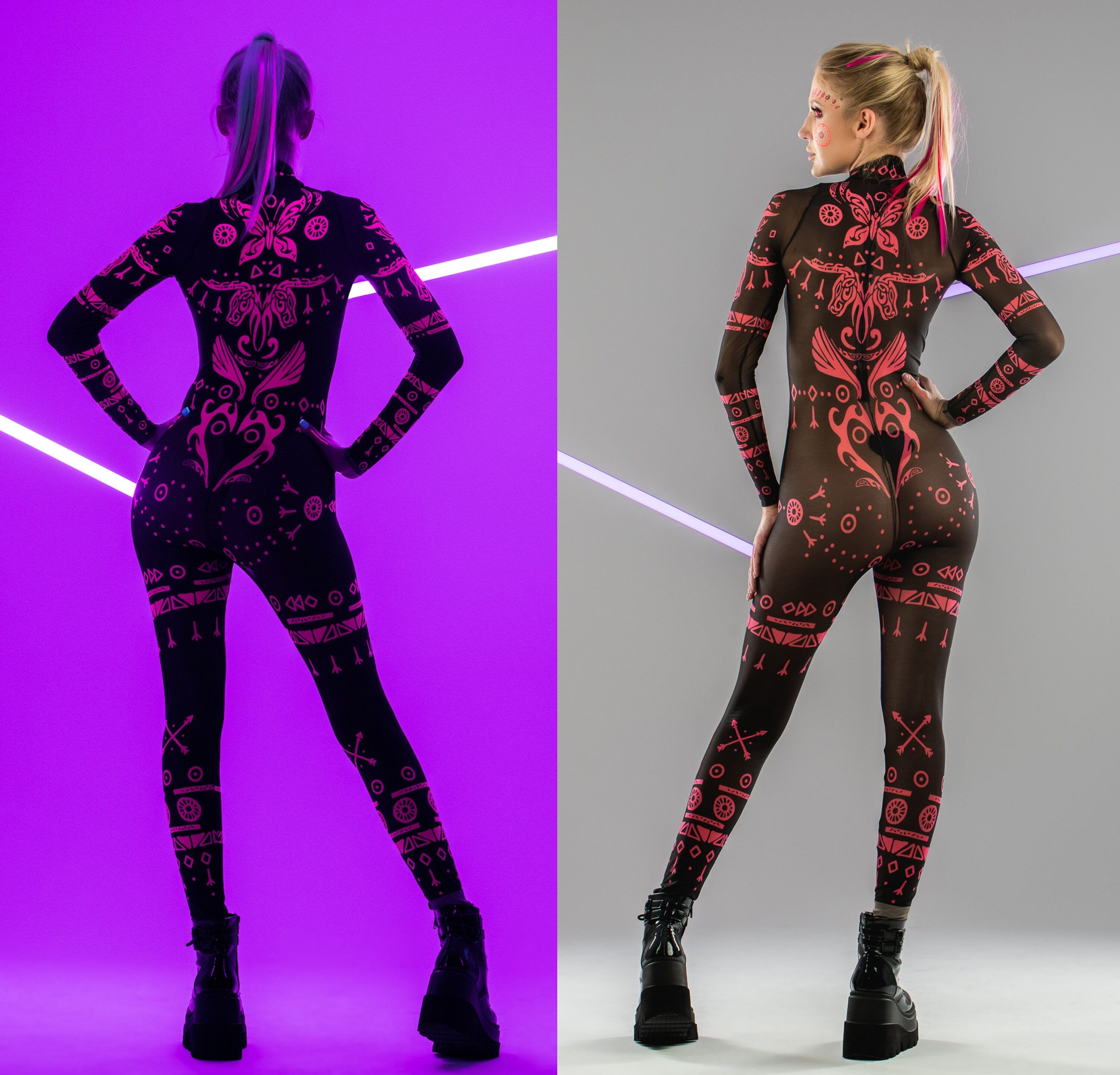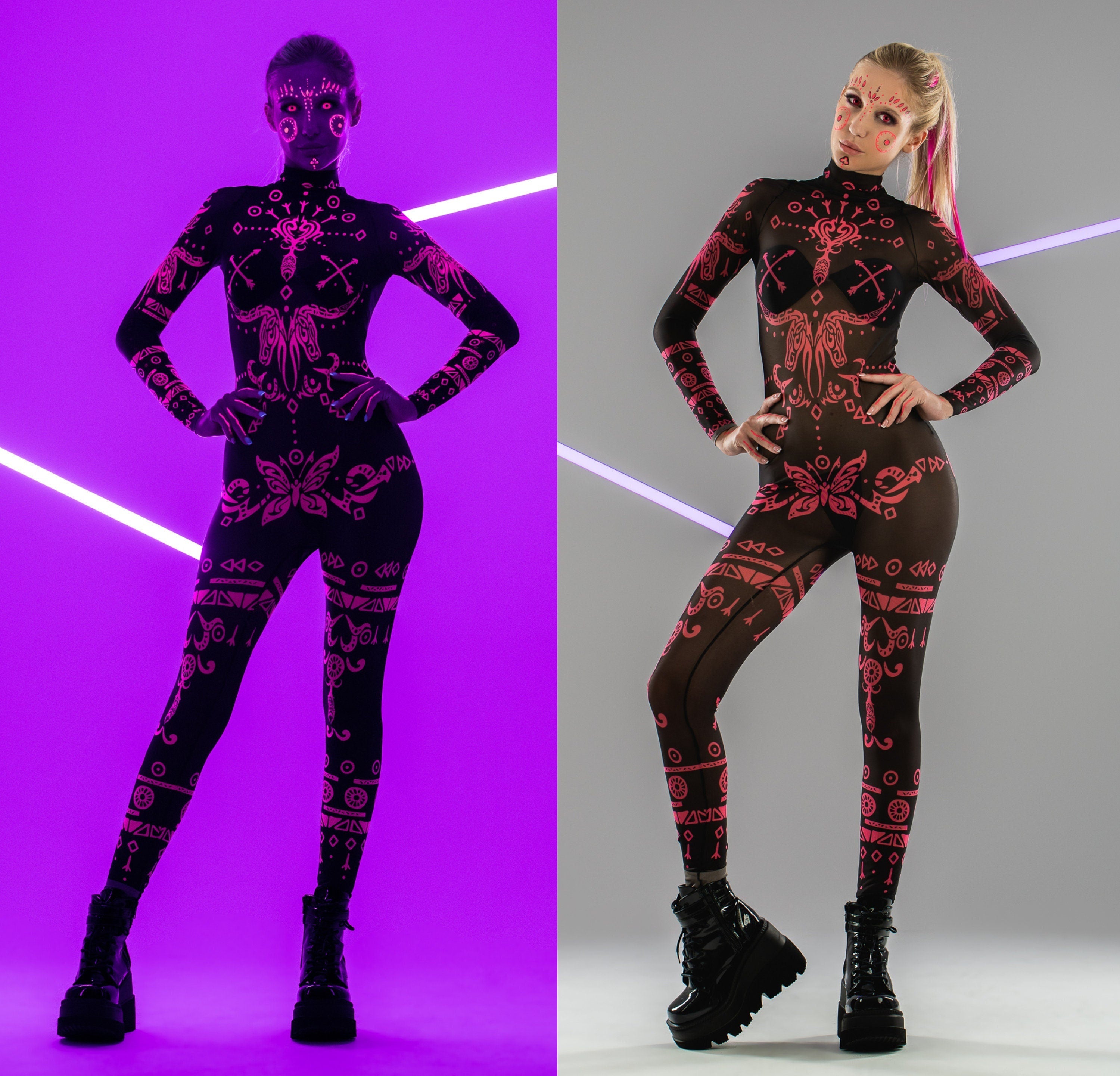 Szukasz stroju, który przyciągnie spojrzenia? Nasz kombinezon z siatki z fluorescencyjnym nadrukiem to doskonały wybór dla miłośników wyrazistych i unikalnych stylizacji "z pazurem"! ✨