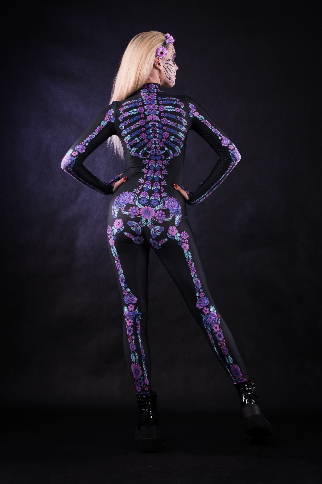Pragniesz zachwycić na Halloweenowej imprezie? Nasz kombinezon z delikatnym motywem kwiatowego szkieletu w ciepłych fioletowo-niebieskich odcieniach to idealny wybór, który łączy unikalny design z niezrównanym komfortem przez całą noc (i dzień!). 🎃✨