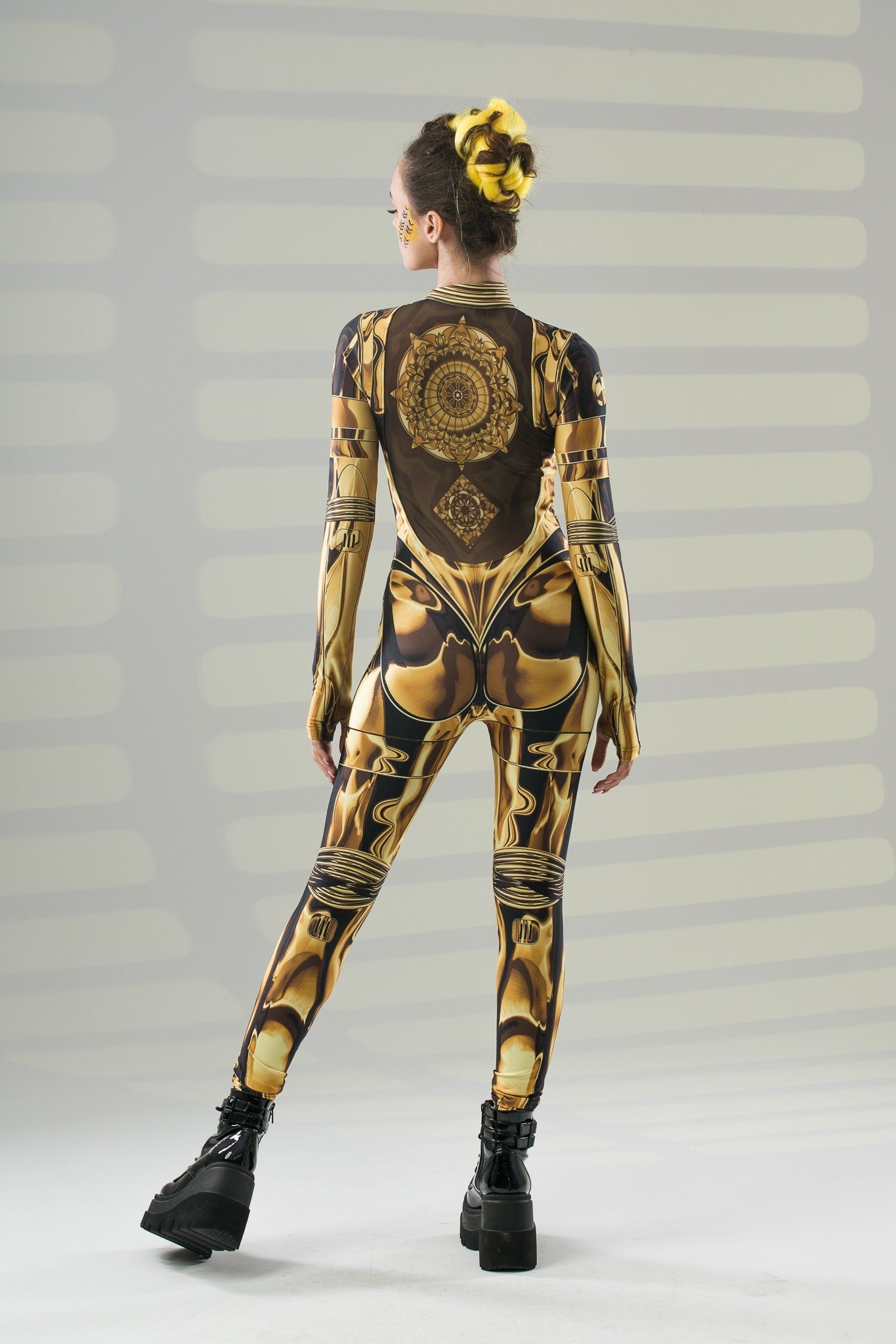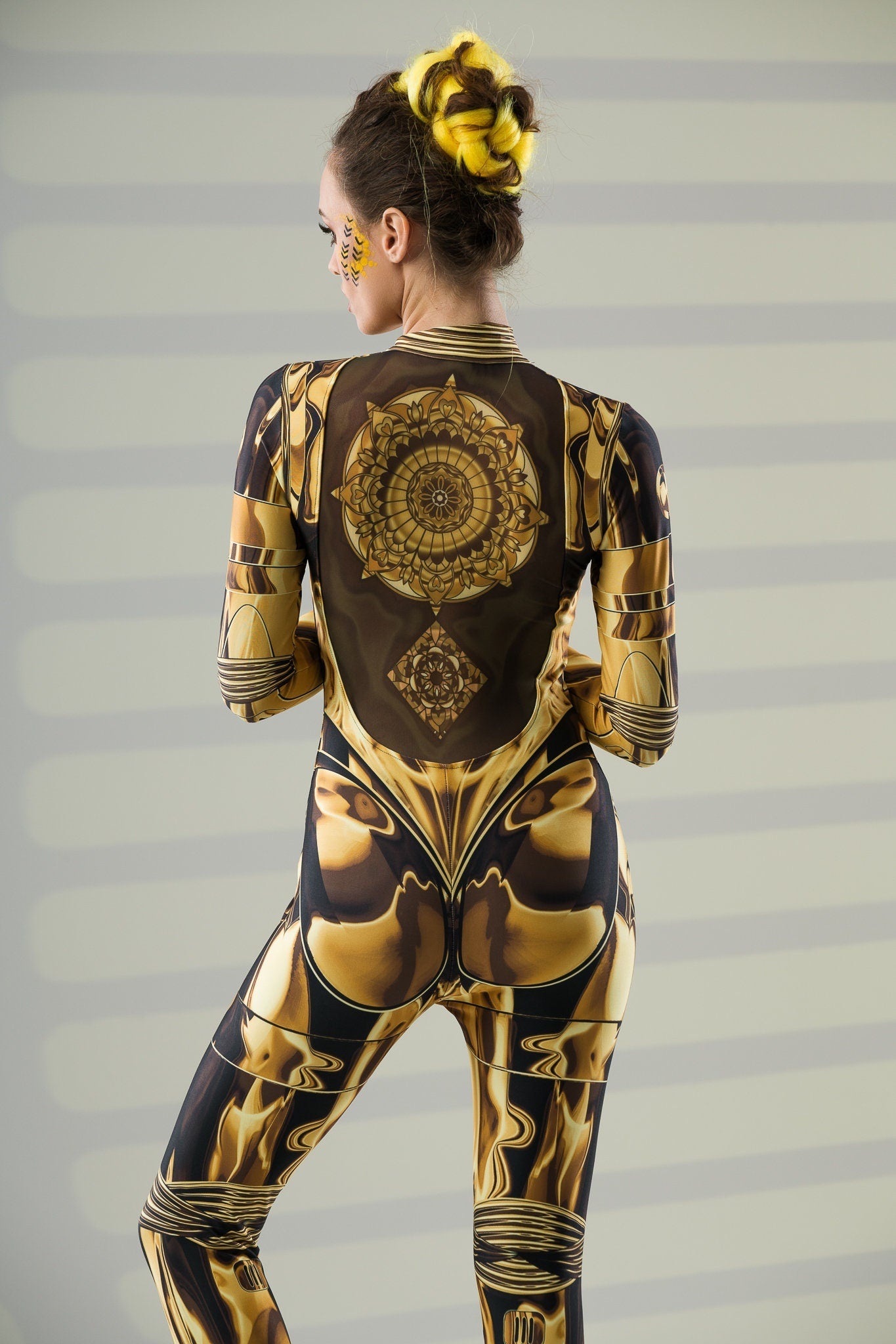 Zachwycaj niepowtarzalnym blaskiem i wyrafinowanym stylem! Ten kombinezon z nadrukiem imitującym lustrzany złoty pancerz i misterną mandalą na plecach to doskonały wybór, by wyróżnić się na każdej imprezie i festiwalu. ✨