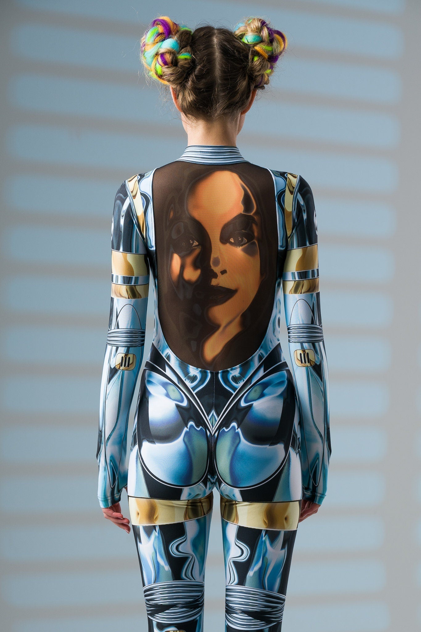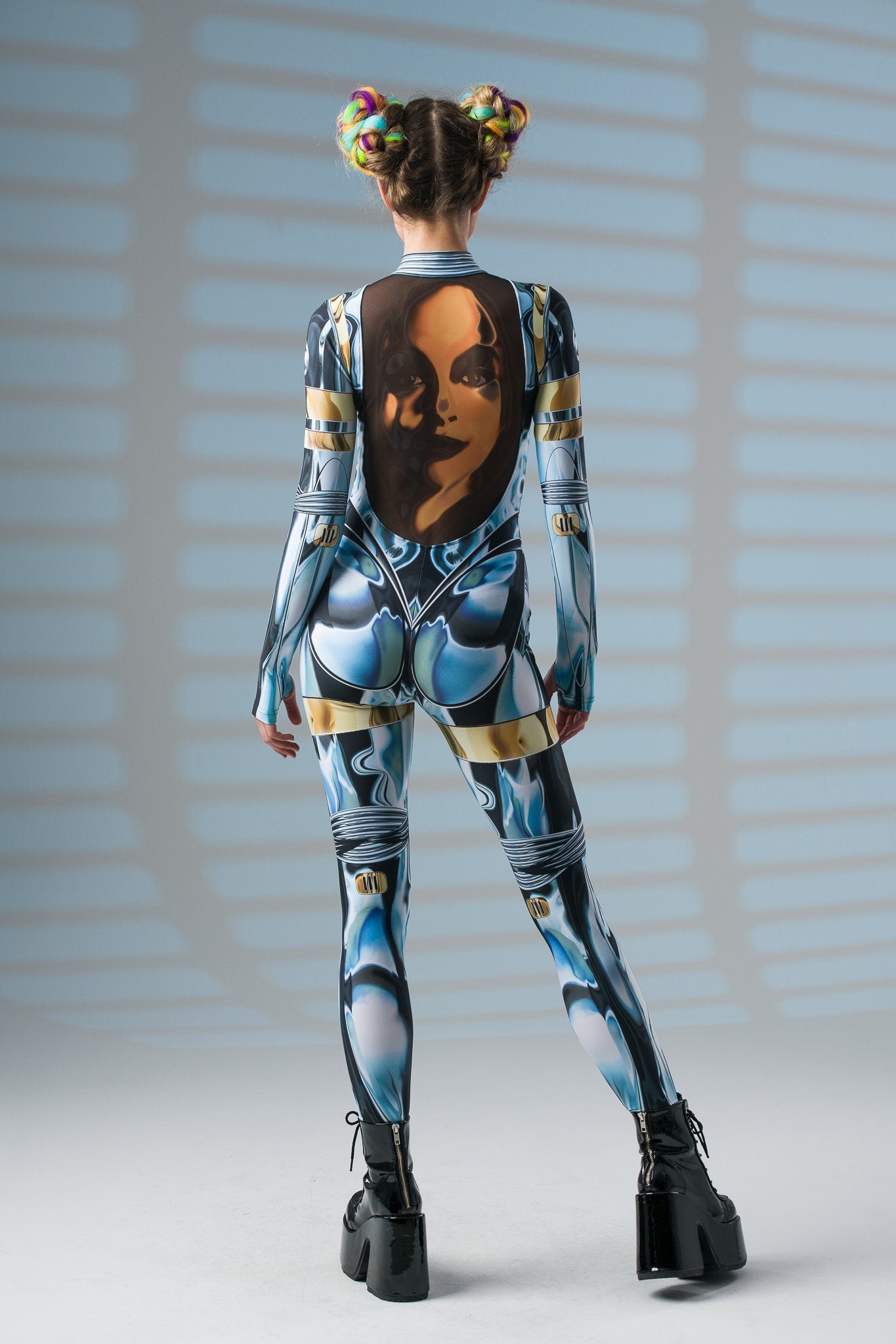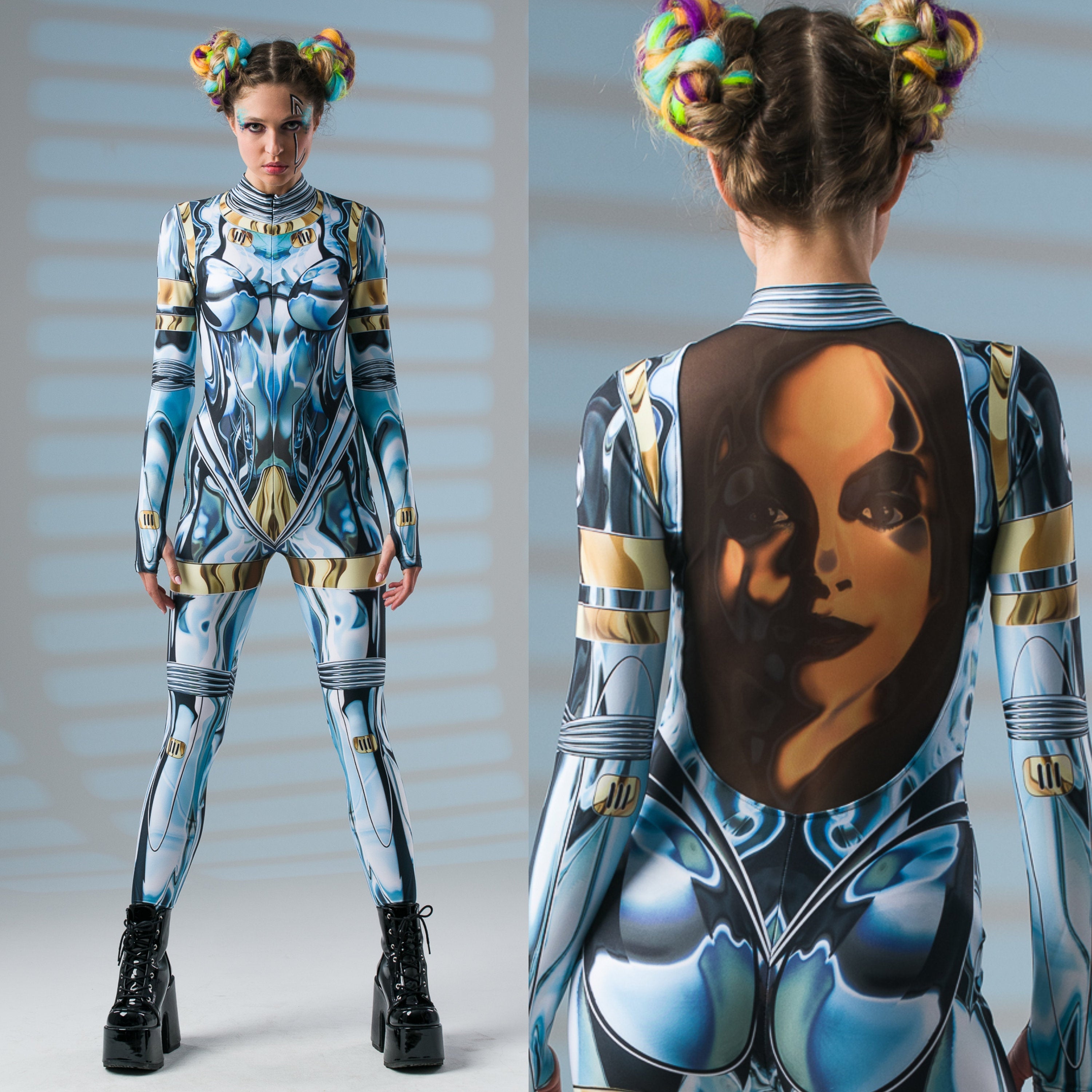 Zachwycaj niepowtarzalnym blaskiem i wyrafinowanym stylem! Ten kombinezon z nadrukiem imitującym lustrzany pancerz i tajemniczą złotą twarzą na plecach to doskonały wybór, by wyróżnić się na każdej imprezie i festiwalu. ✨