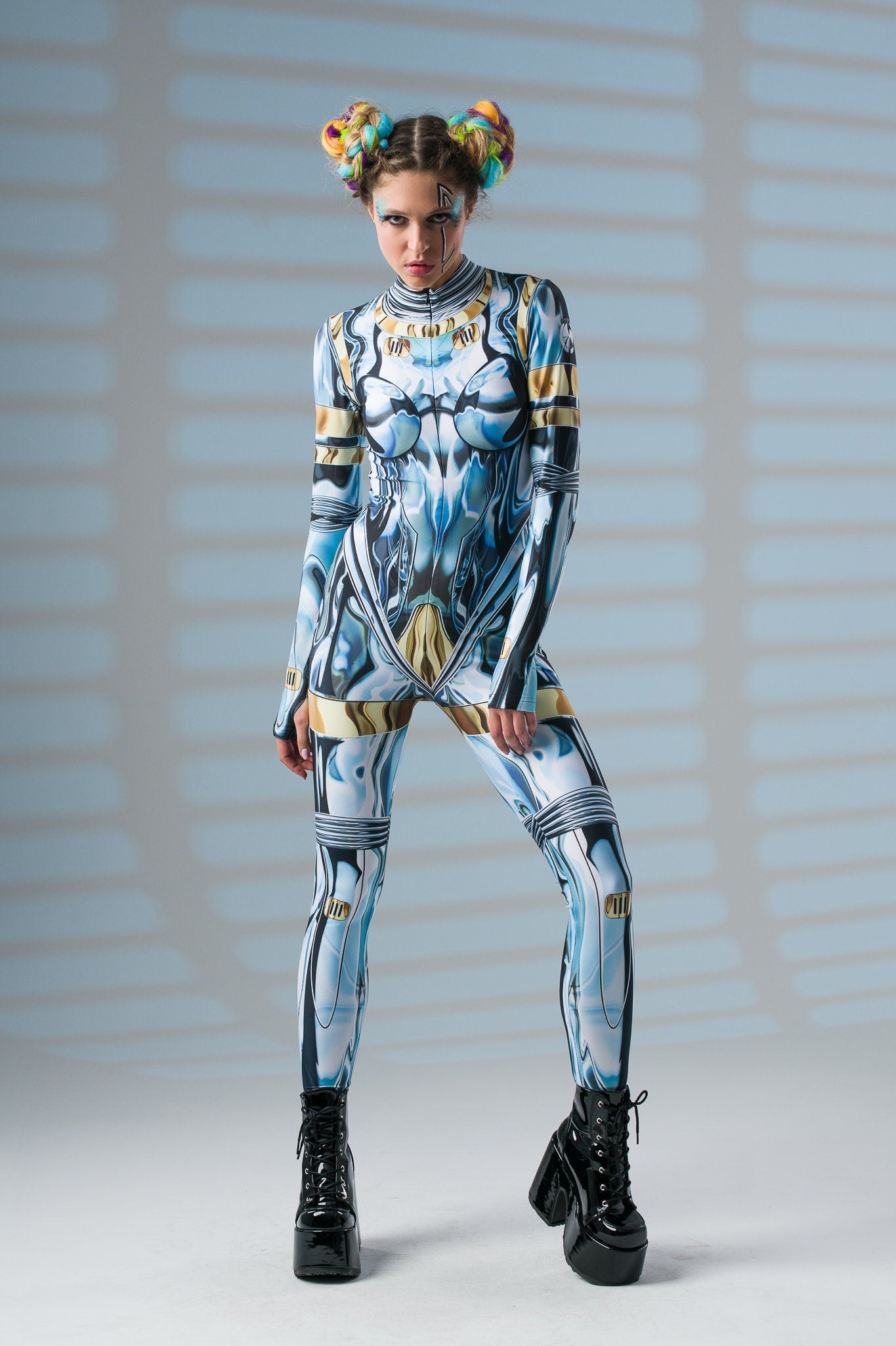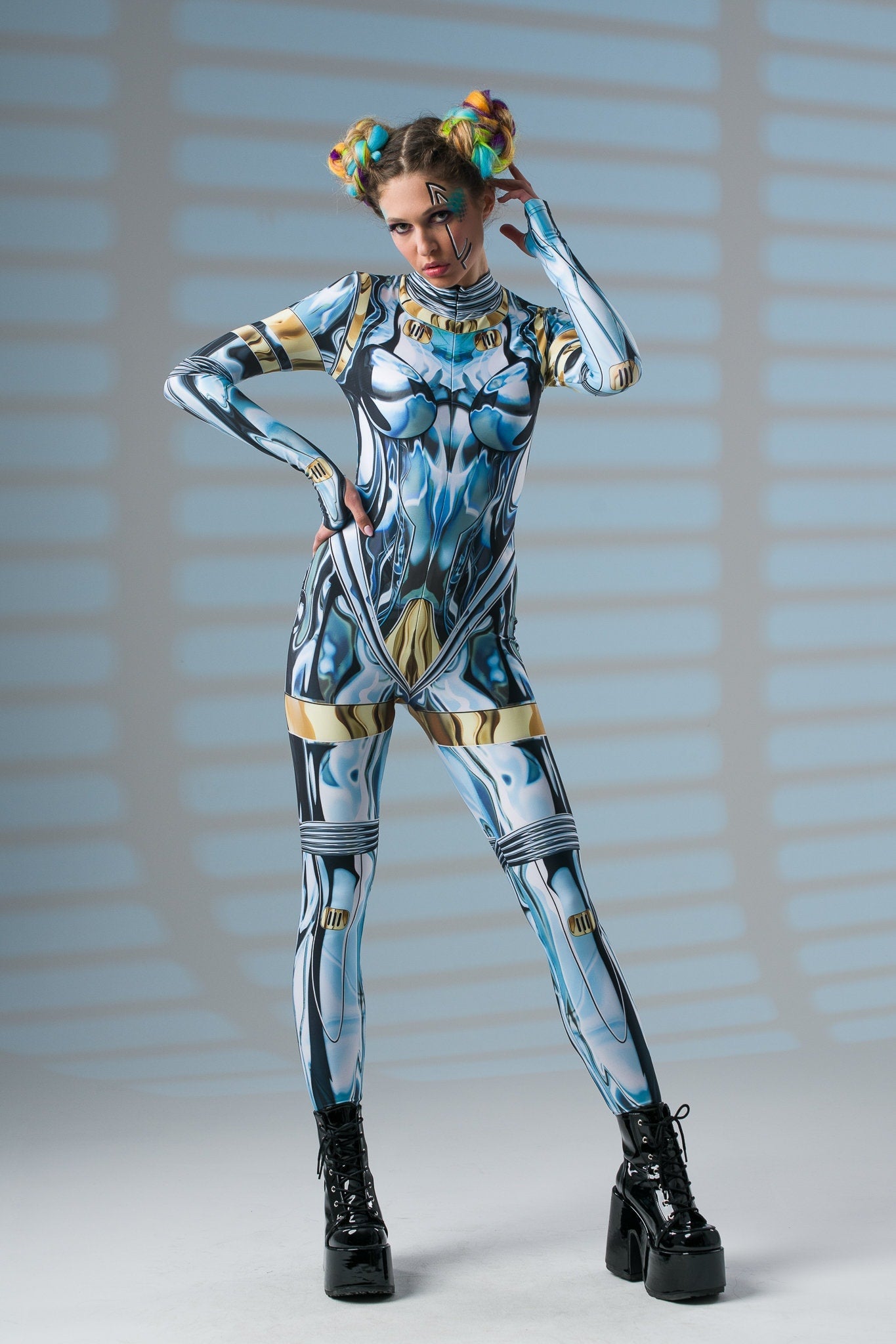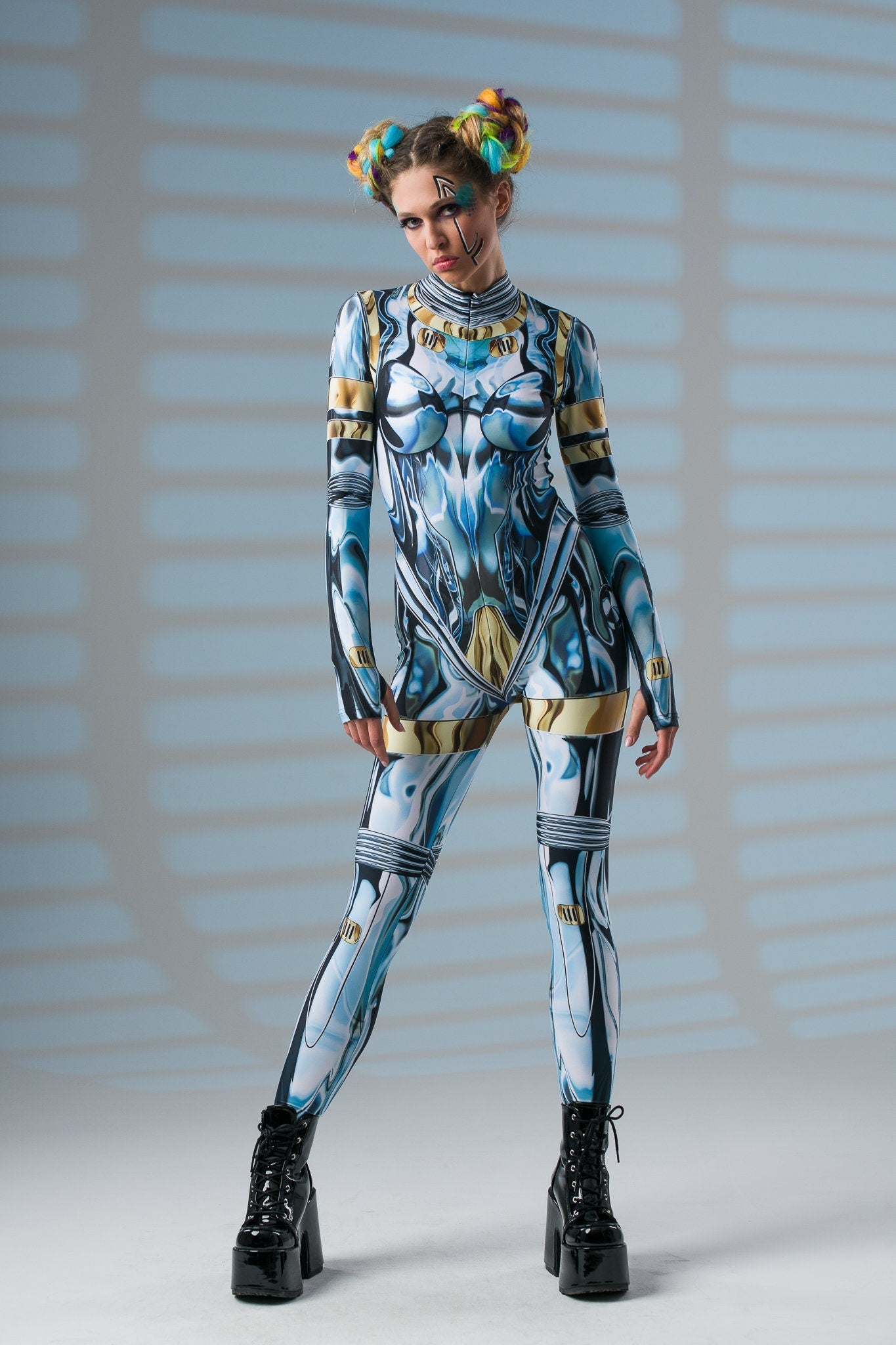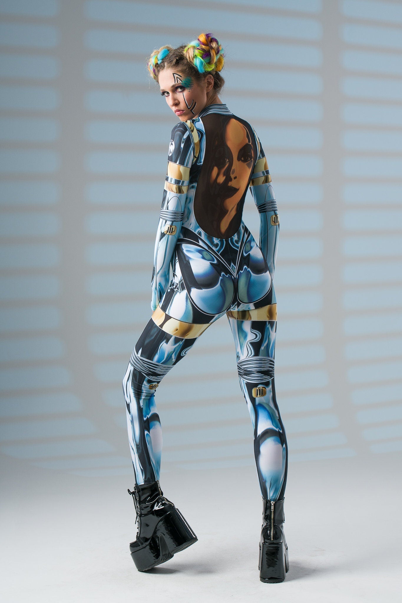 Zachwycaj niepowtarzalnym blaskiem i wyrafinowanym stylem! Ten kombinezon z nadrukiem imitującym lustrzany pancerz i tajemniczą złotą twarzą na plecach to doskonały wybór, by wyróżnić się na każdej imprezie i festiwalu. ✨