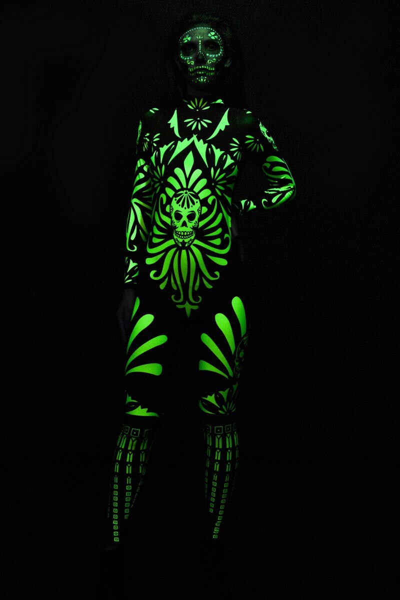 Chcesz być gwiazdą Halloween? Nasz kombinezon z fluorescencyjnym nadrukiem meksykańskich czaszek to idealny wybór, który wyróżni Cię na każdej imprezie, zapewniając jednocześnie wygodę i komfort przez całą noc! ✨💀