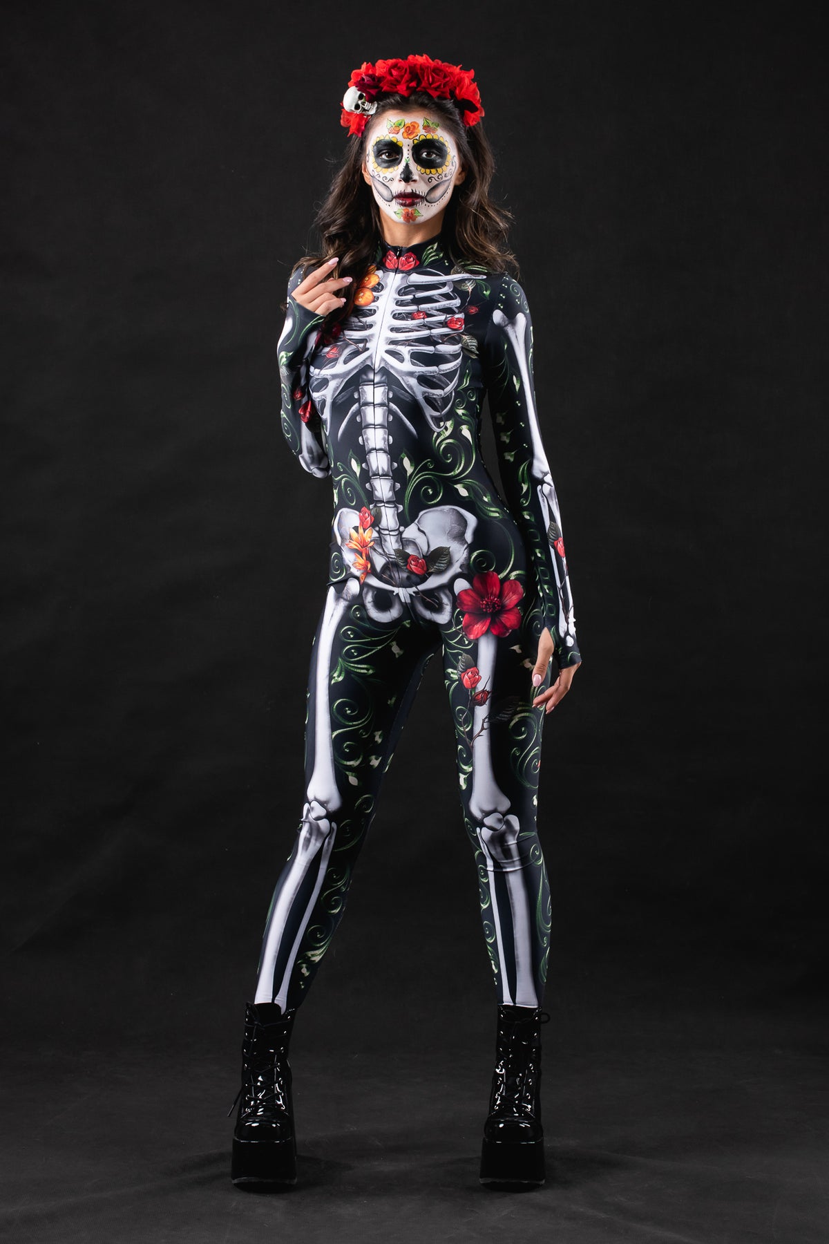Pragniesz zachwycić na Halloweenowej imprezie? Nasz kombinezon z nadrukiem białego szkieletu oraz ornamentów i kwiatów w ciepłej zielono czerwonej kolorystyce to idealny wybór, który łączy unikalny design z niezrównanym komfortem przez całą noc (i dzień!). 🎃✨
