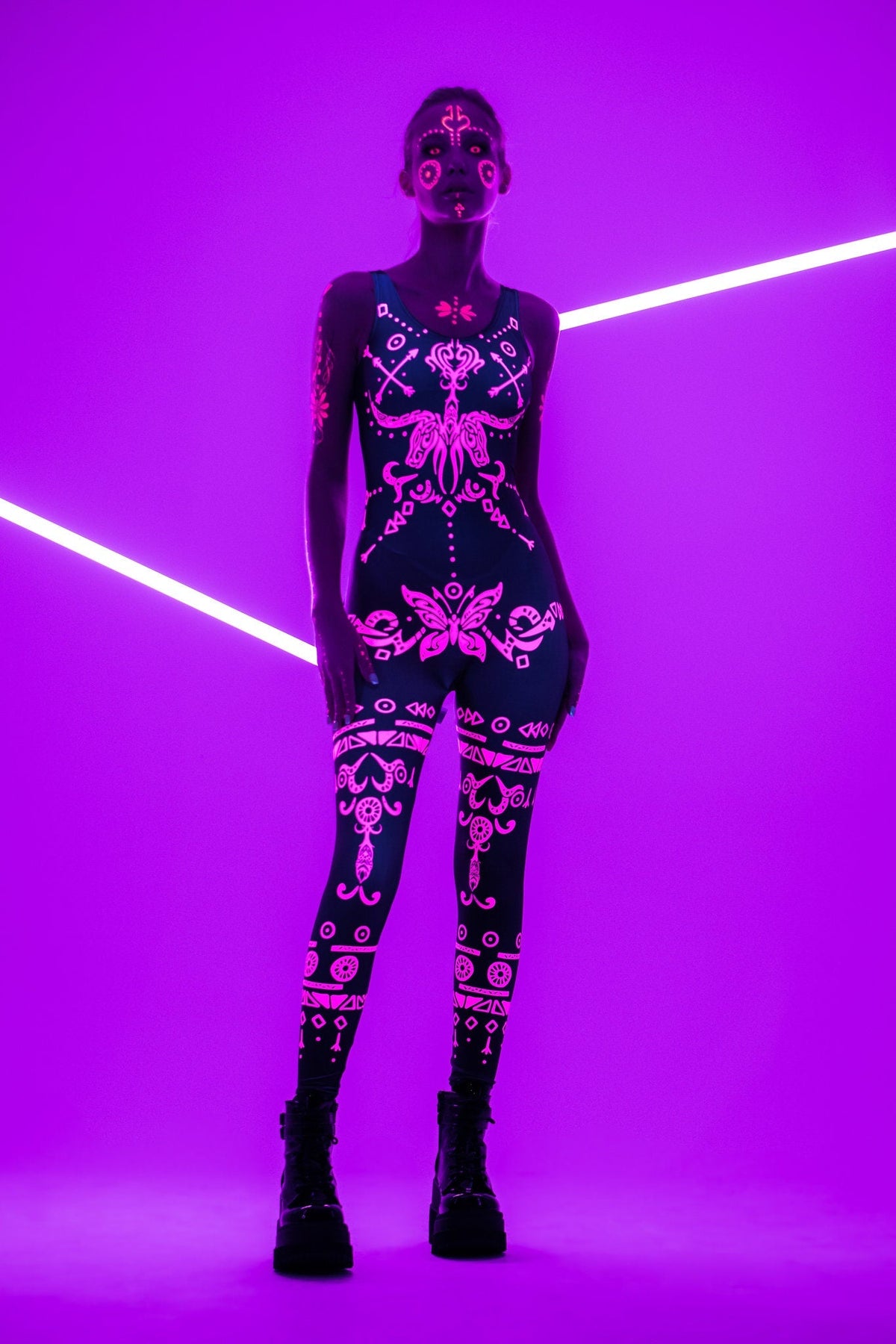 Szukasz oryginalnego i wygodnego stroju na festiwale, imprezy lub inne wyjątkowe okazje? Nasz kombinezon z fluorescencyjnym nadrukiem i głębokim dekoltem to doskonały wybór, który nie tylko wyróżni Cię z tłumu, ale także zapewni komfort przez cały dzień! 🎉✨