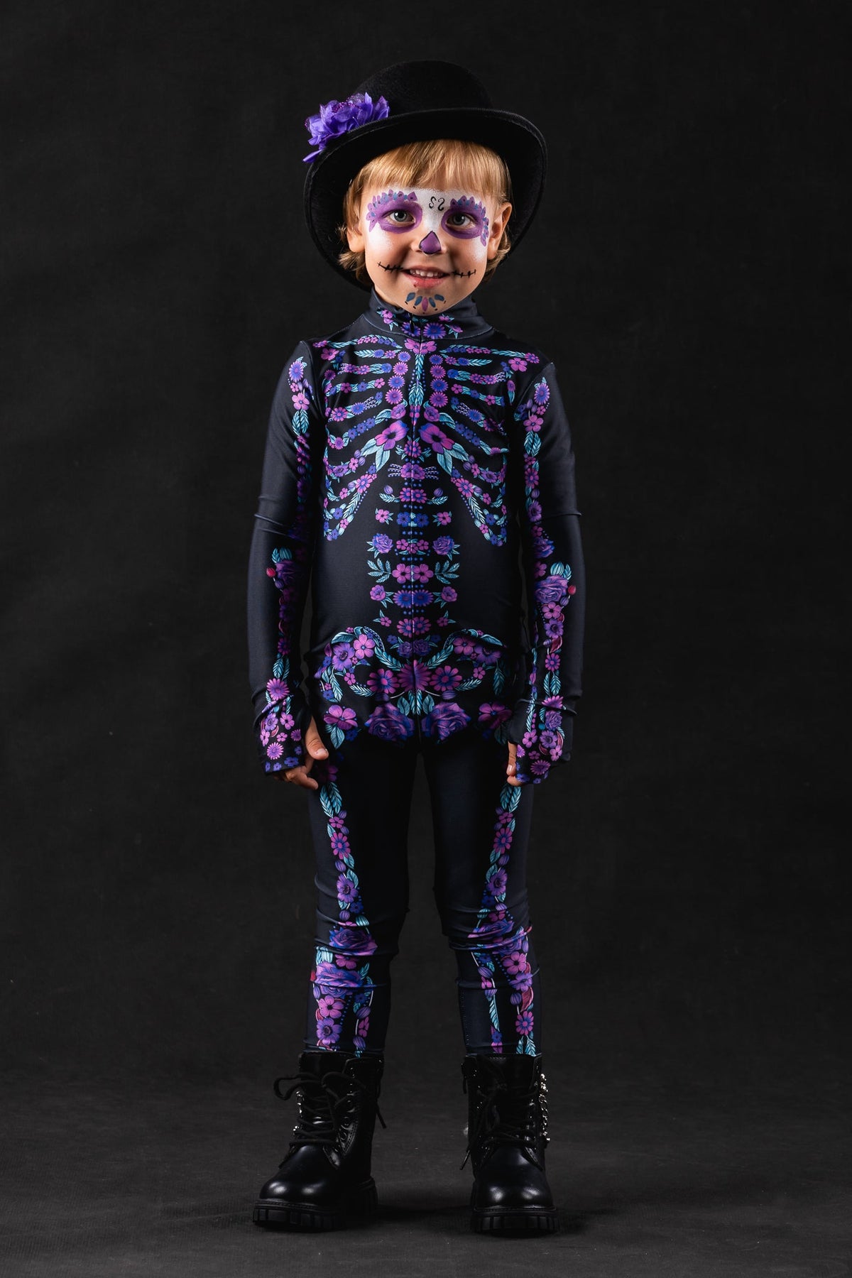 Przygotuj się na niezapomnianą przygodę Halloween! Nasz kombinezon z motywem fioletowo-niebieskiego szkieletu z kwiatów to doskonały wybór, łączący unikalny design z komfortem na cały dzień. 🎃✨